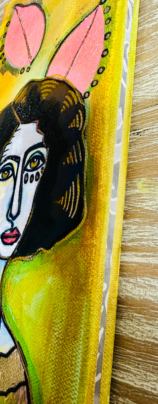 Original, signed painting-12x24” wide collage edge canvas: Abstract portrait w/ mixed media