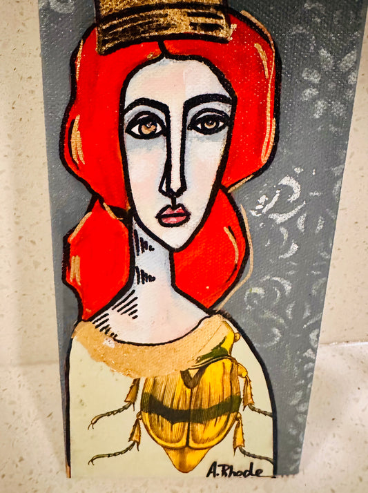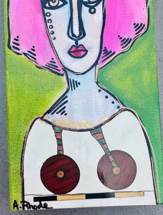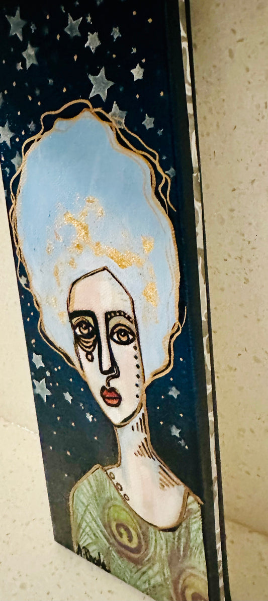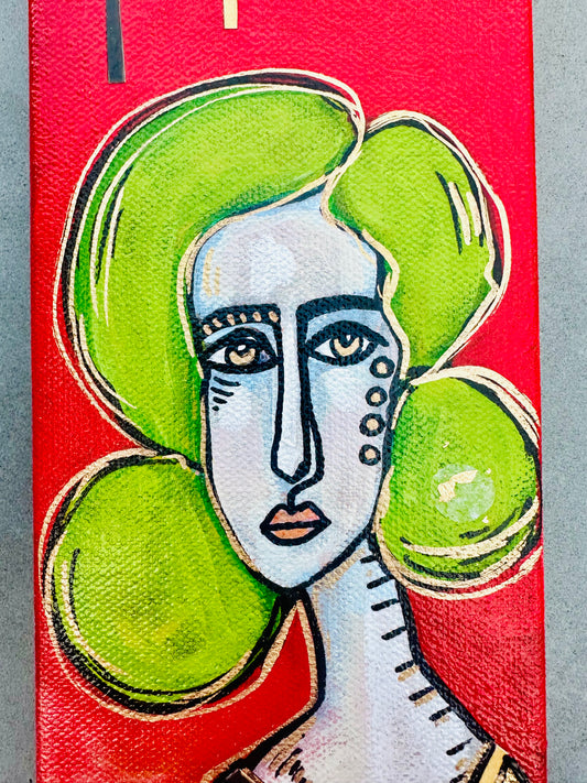 Original, signed mini /slender painting on collaged edged canvas Abstract portrait w/mixed media 4x12”