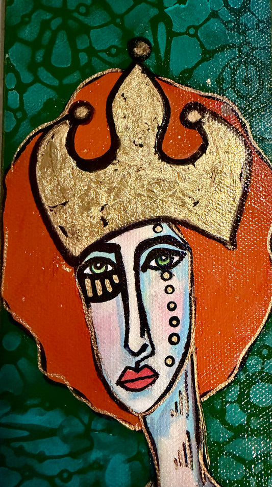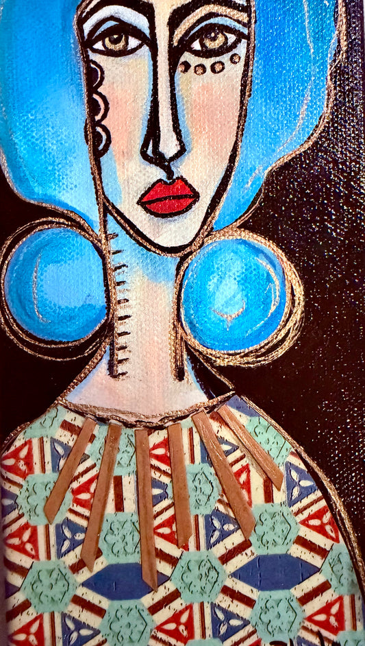 Original, signed mini /slender painting on canvas. Abstract portrait w/mixed media 4x12”