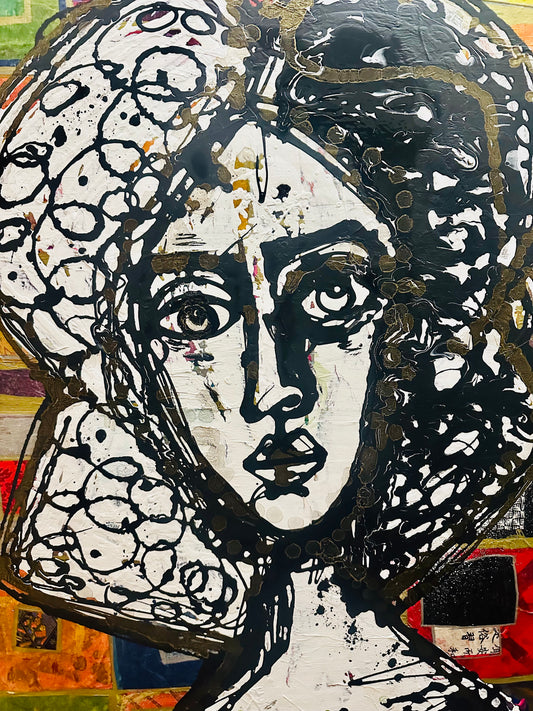 Original painting on black canvas. Approx. 40x40”Abstract portrait w/mixed media collage & metallic ink/gold leaf