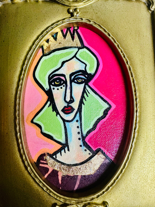 Original painting on canvas board in vintage gold frame-23x29”Abstract portrait w/mixed media collage