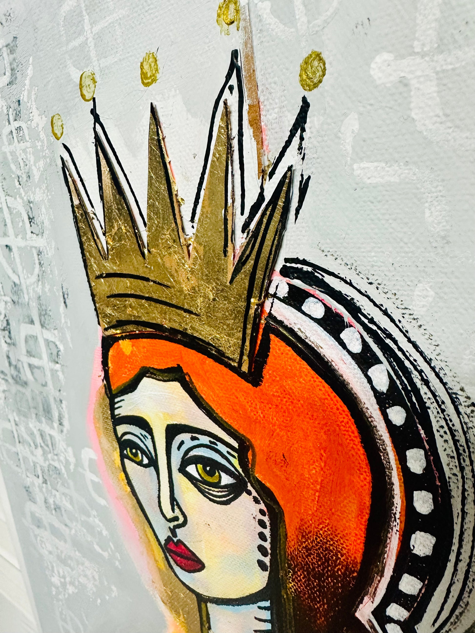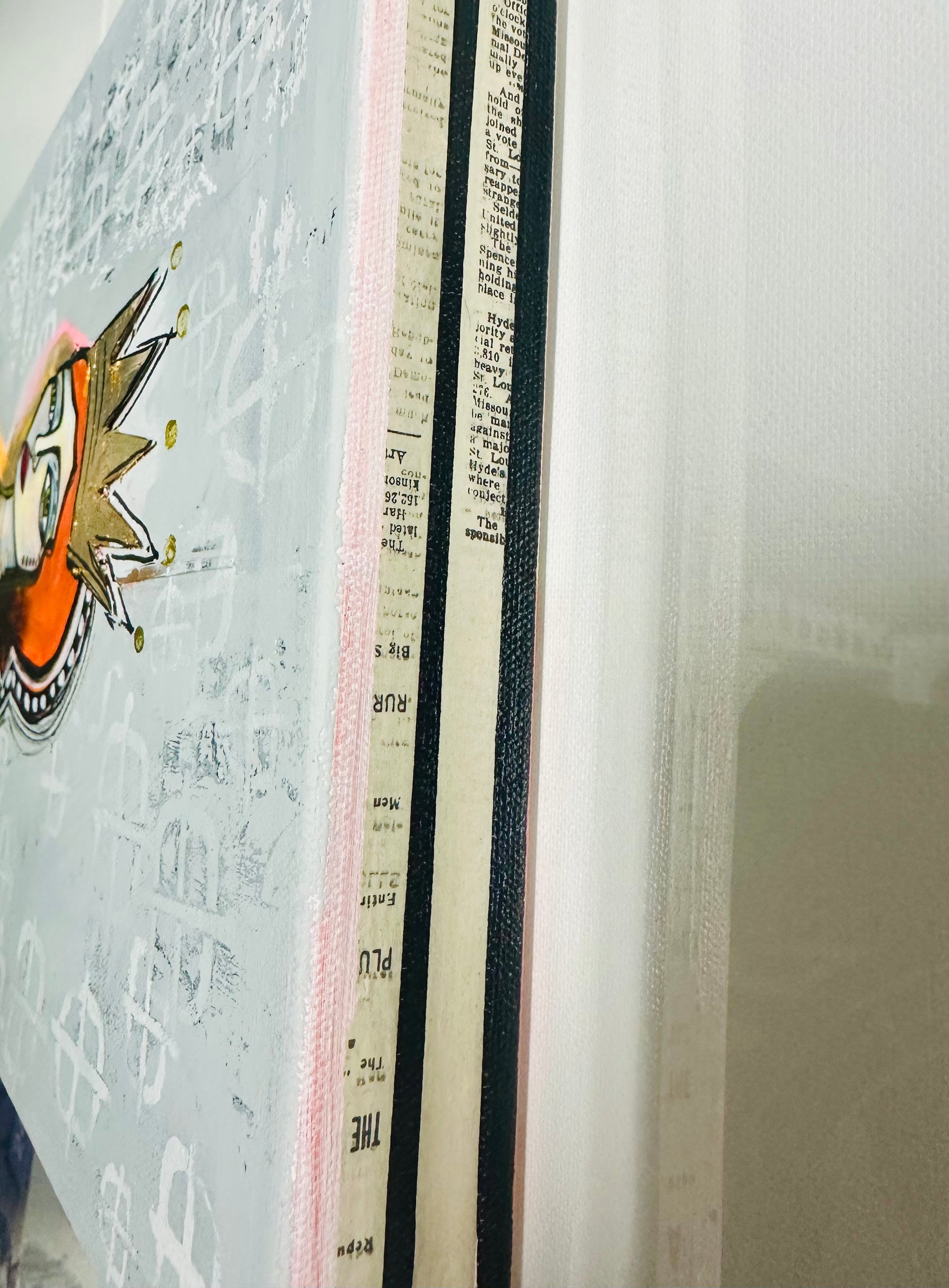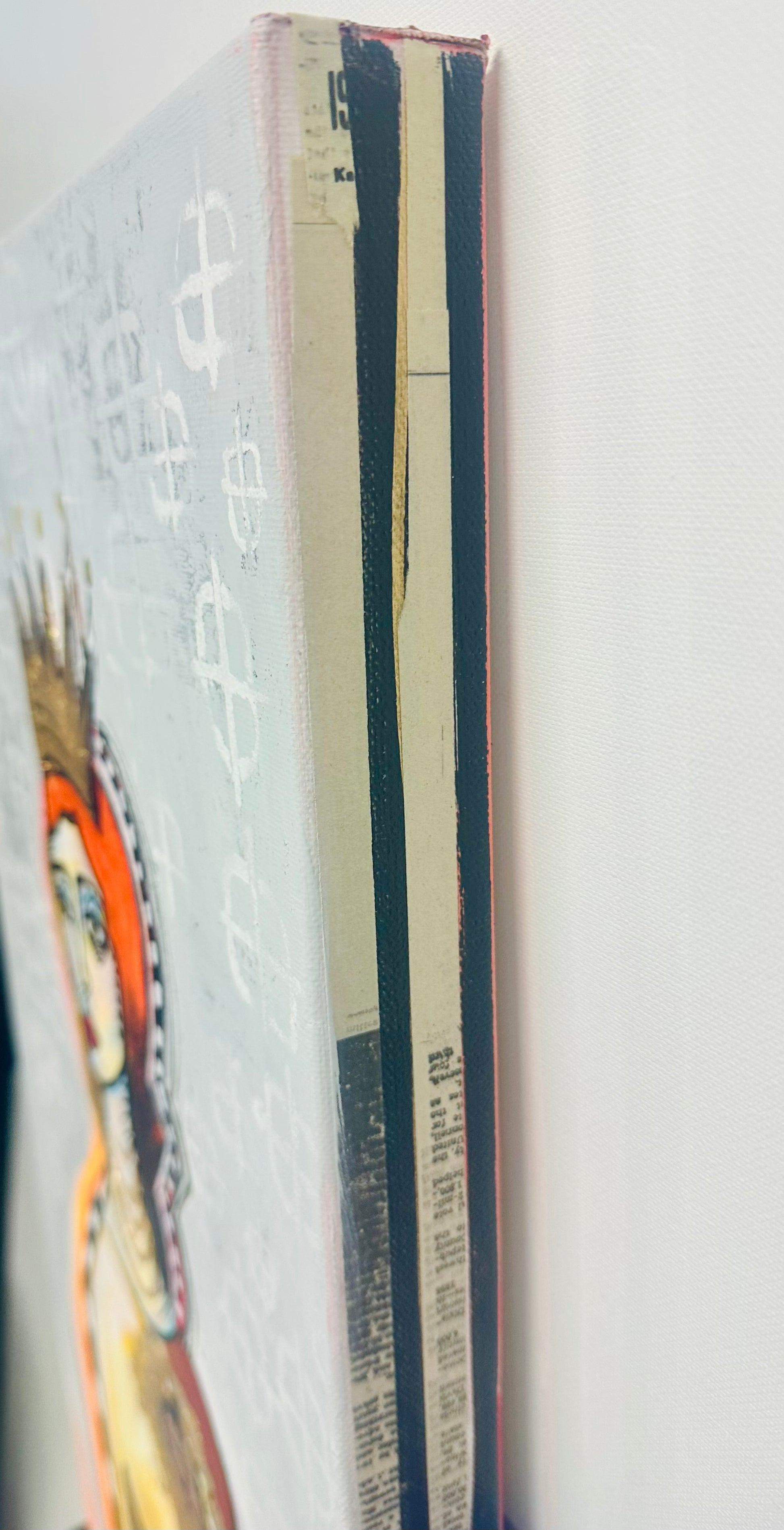 Original, signed painting-12x24” wide collage edge canvas: Abstract portrait w/ mixed media