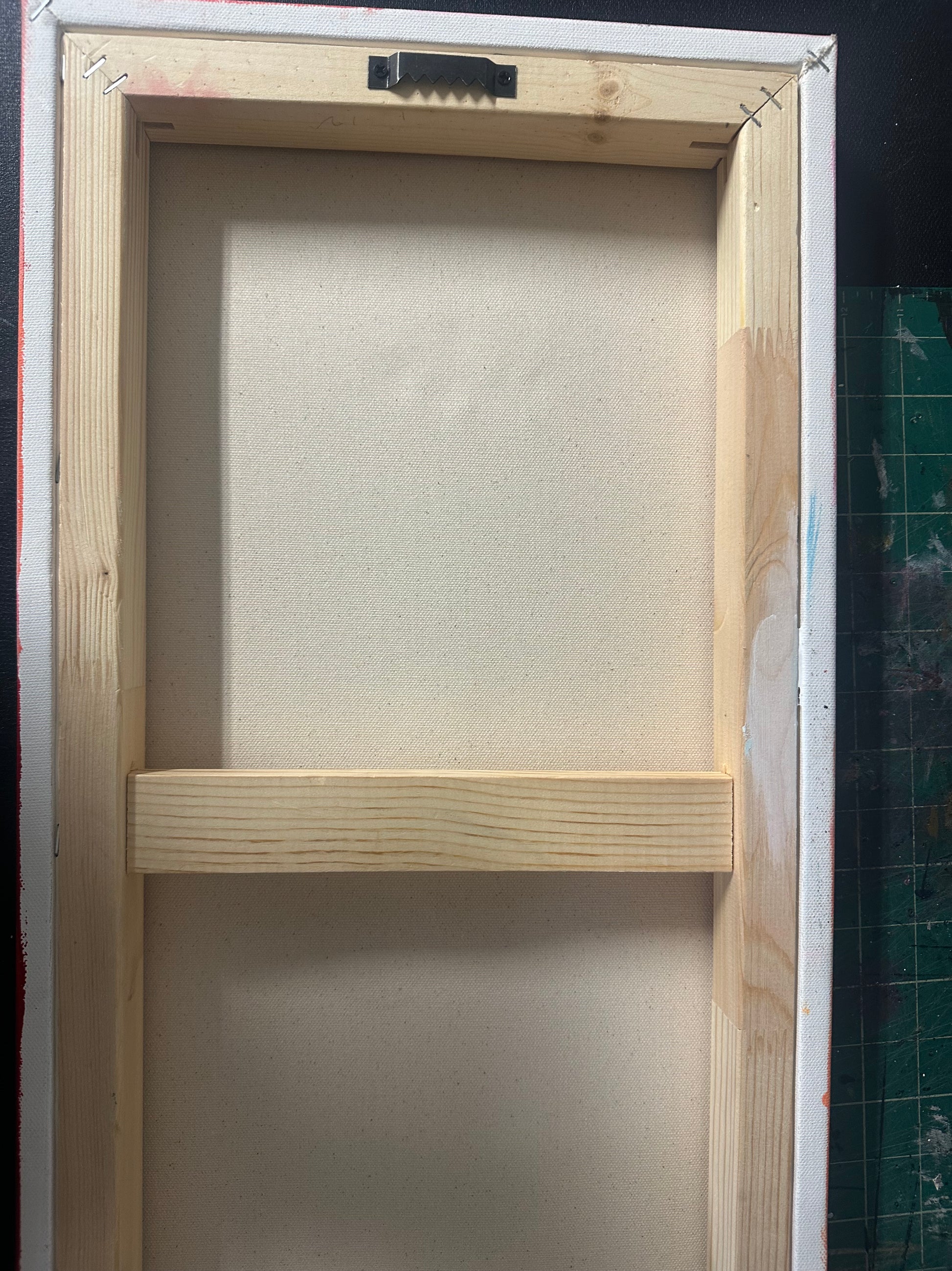 Painting is sealed with several layers of gloss varnish. piece is wired for display photos, but has side hangers for more permanent hang.