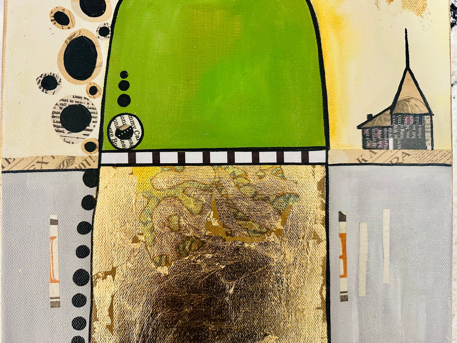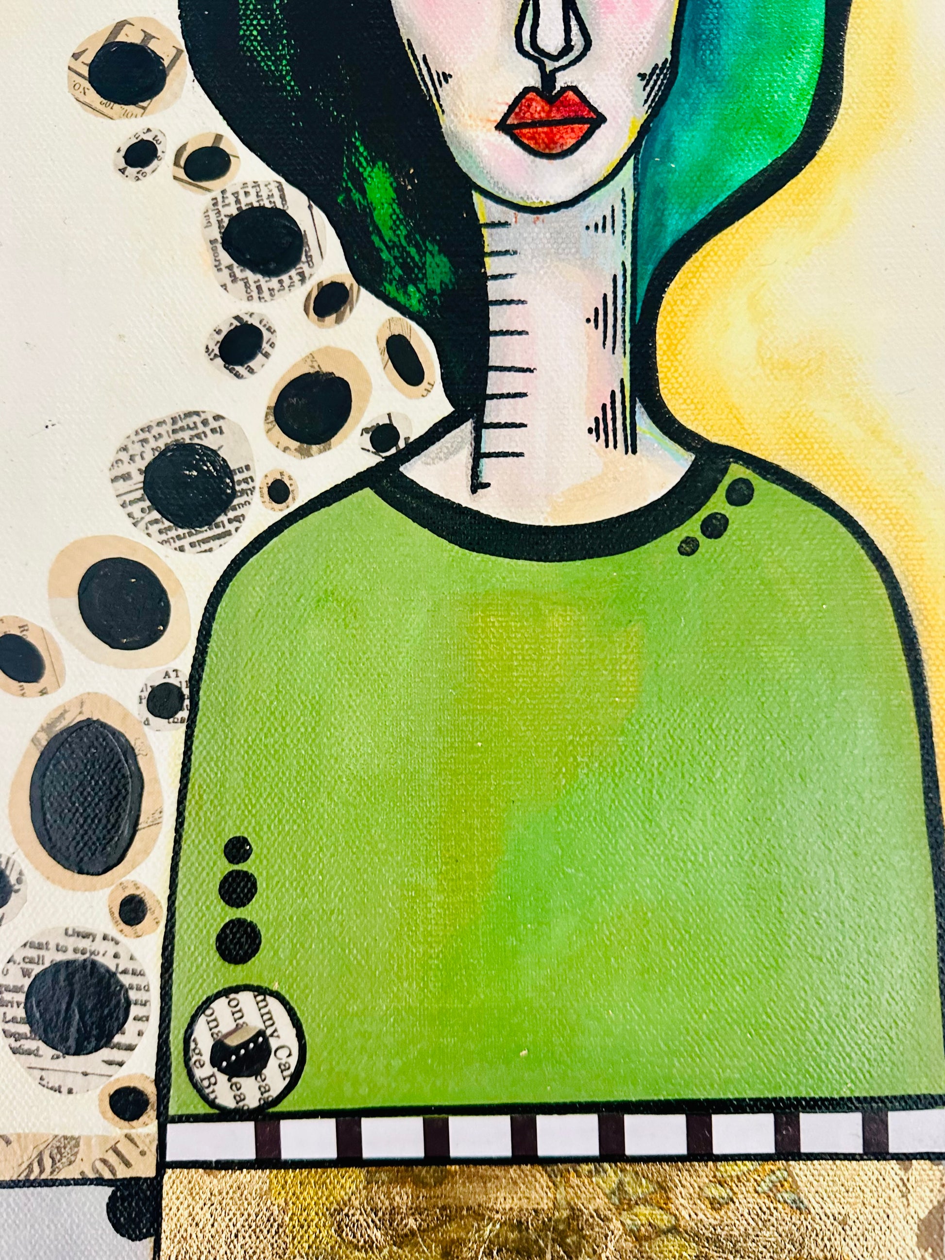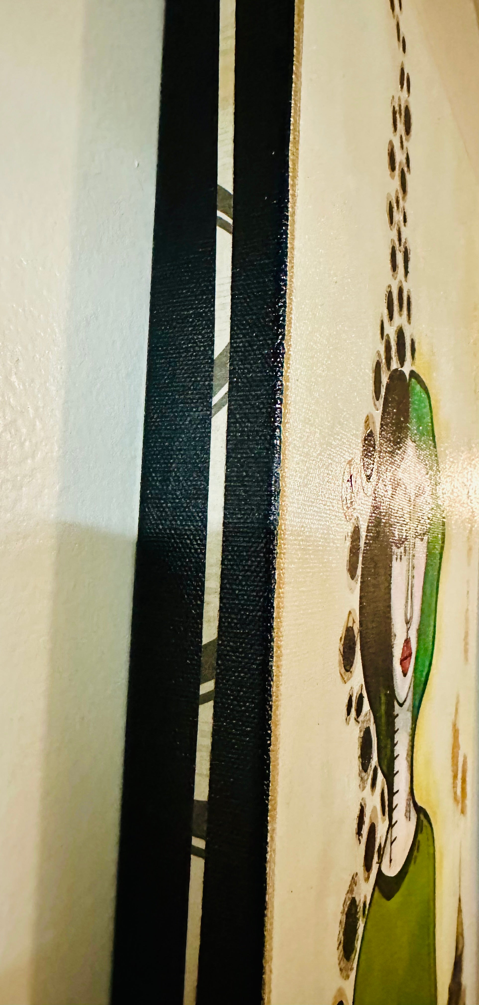 Original, signed painting-12x24” wide collage edge canvas: Abstract portrait w/ mixed media