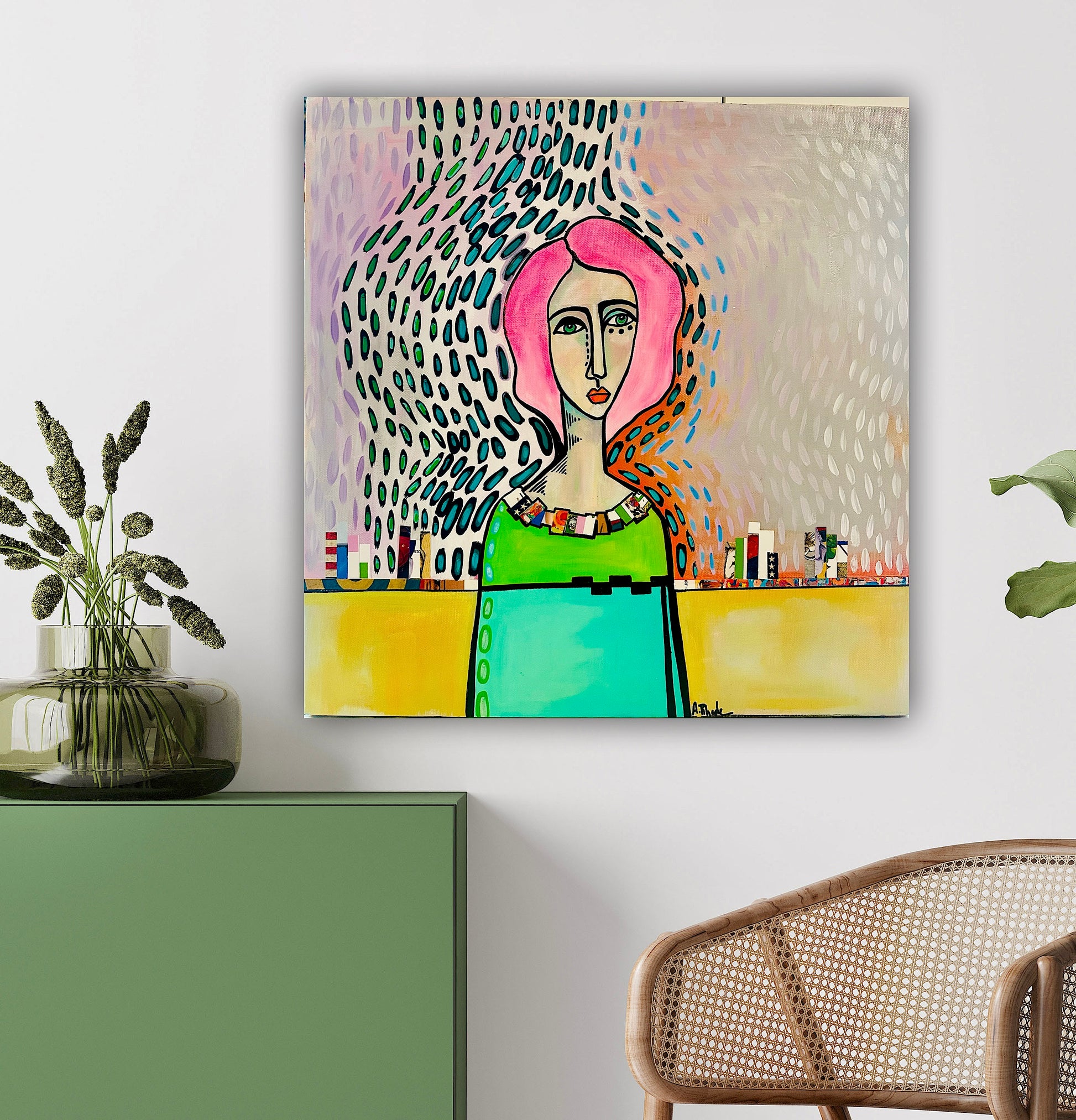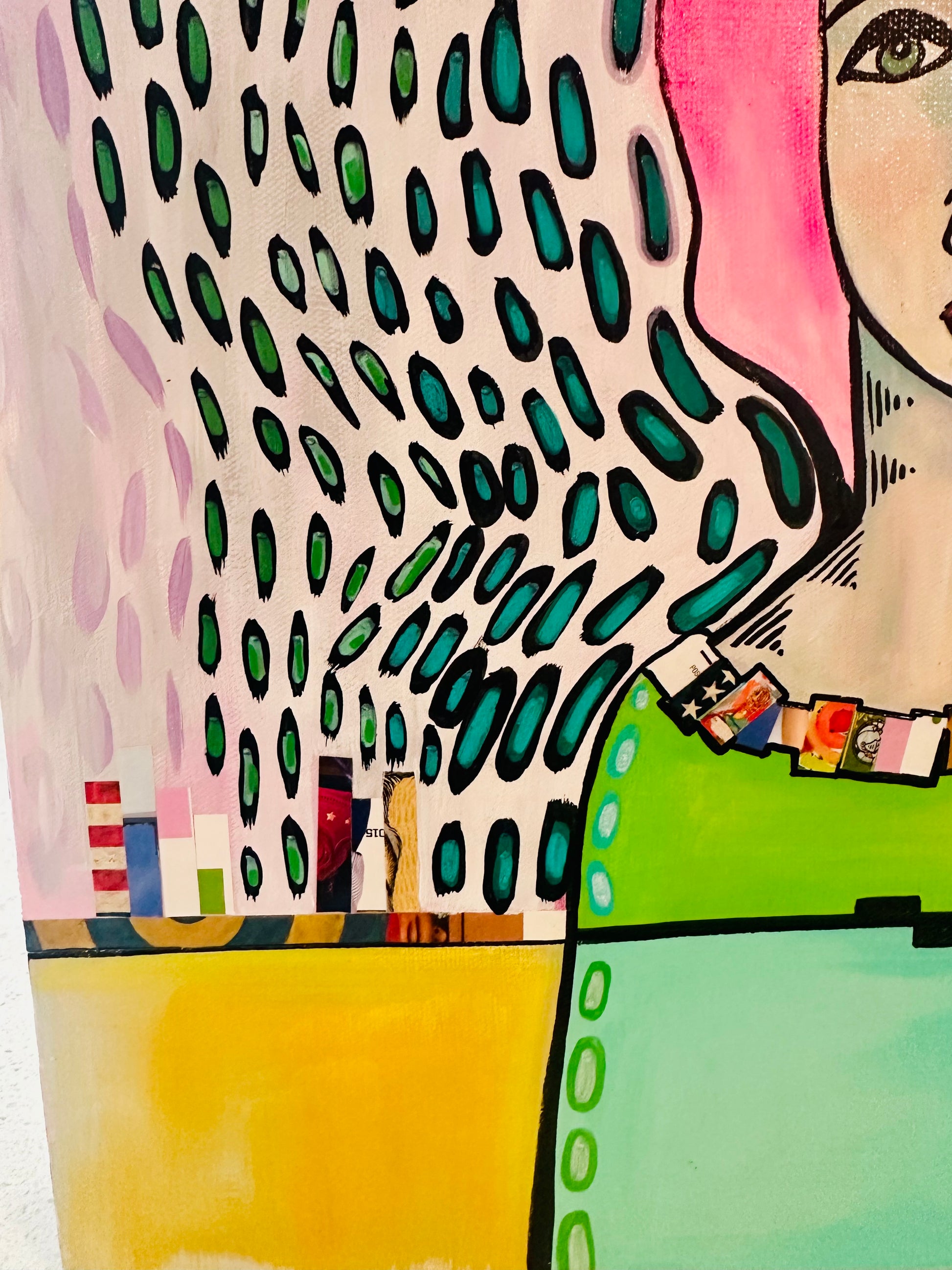 Original, signed painting-18x18” wide collage edge canvas: Abstract portrait w/ mixed media